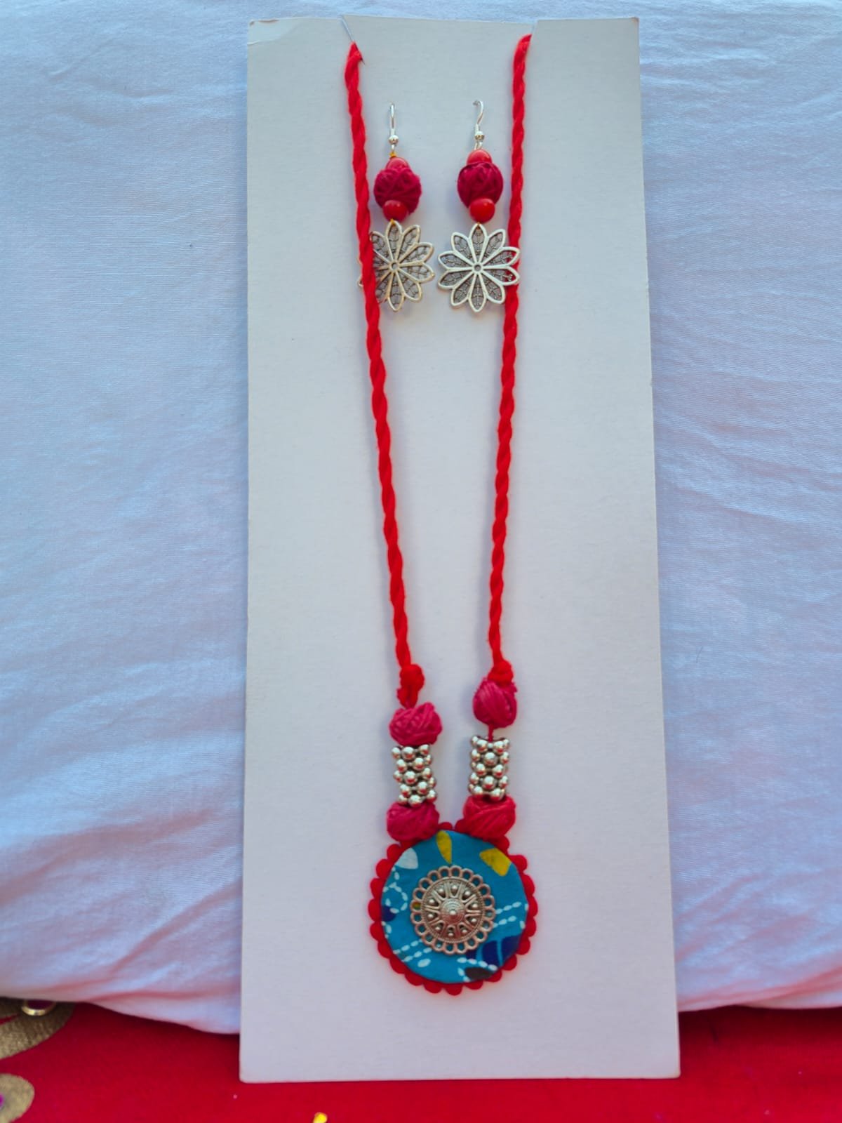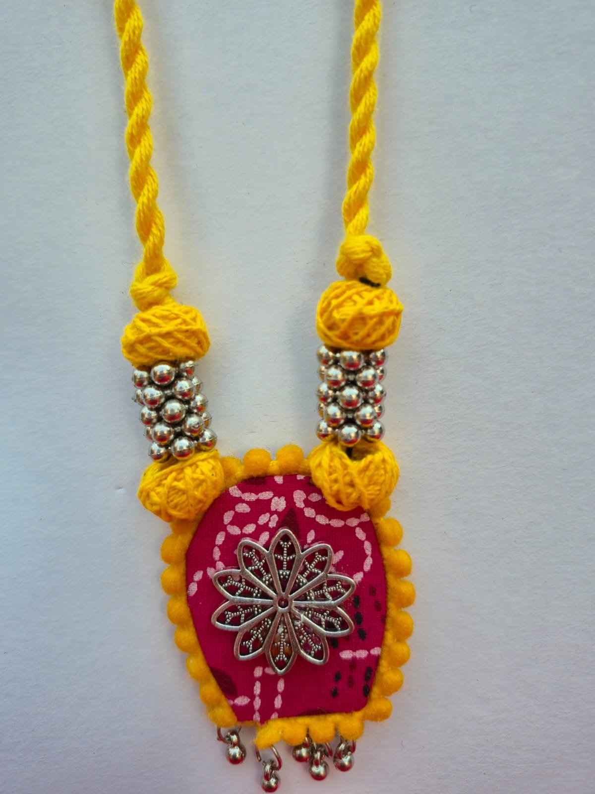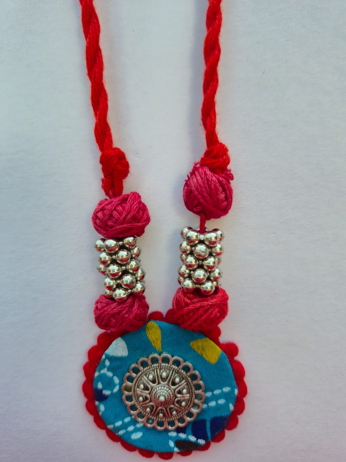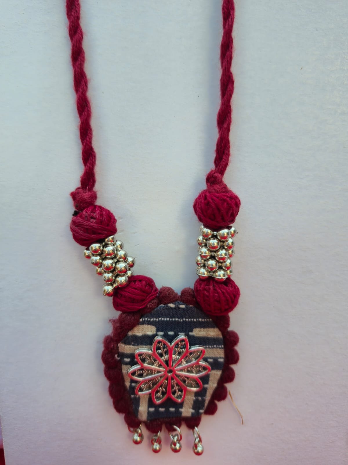 Unique Design: Features a handcrafted fabric-based pendant with a silver-tone floral filigree centerpiece and dangling beads.