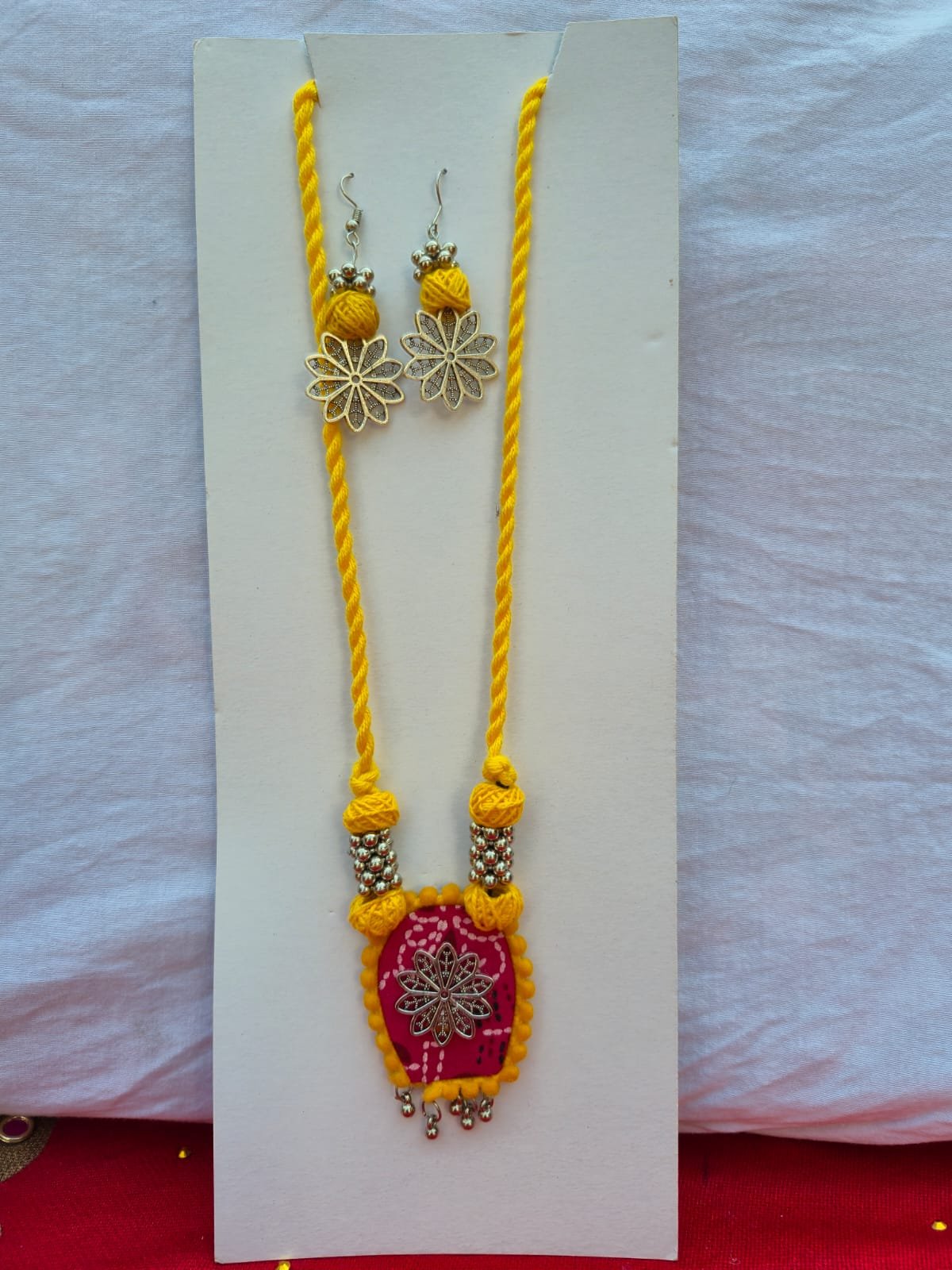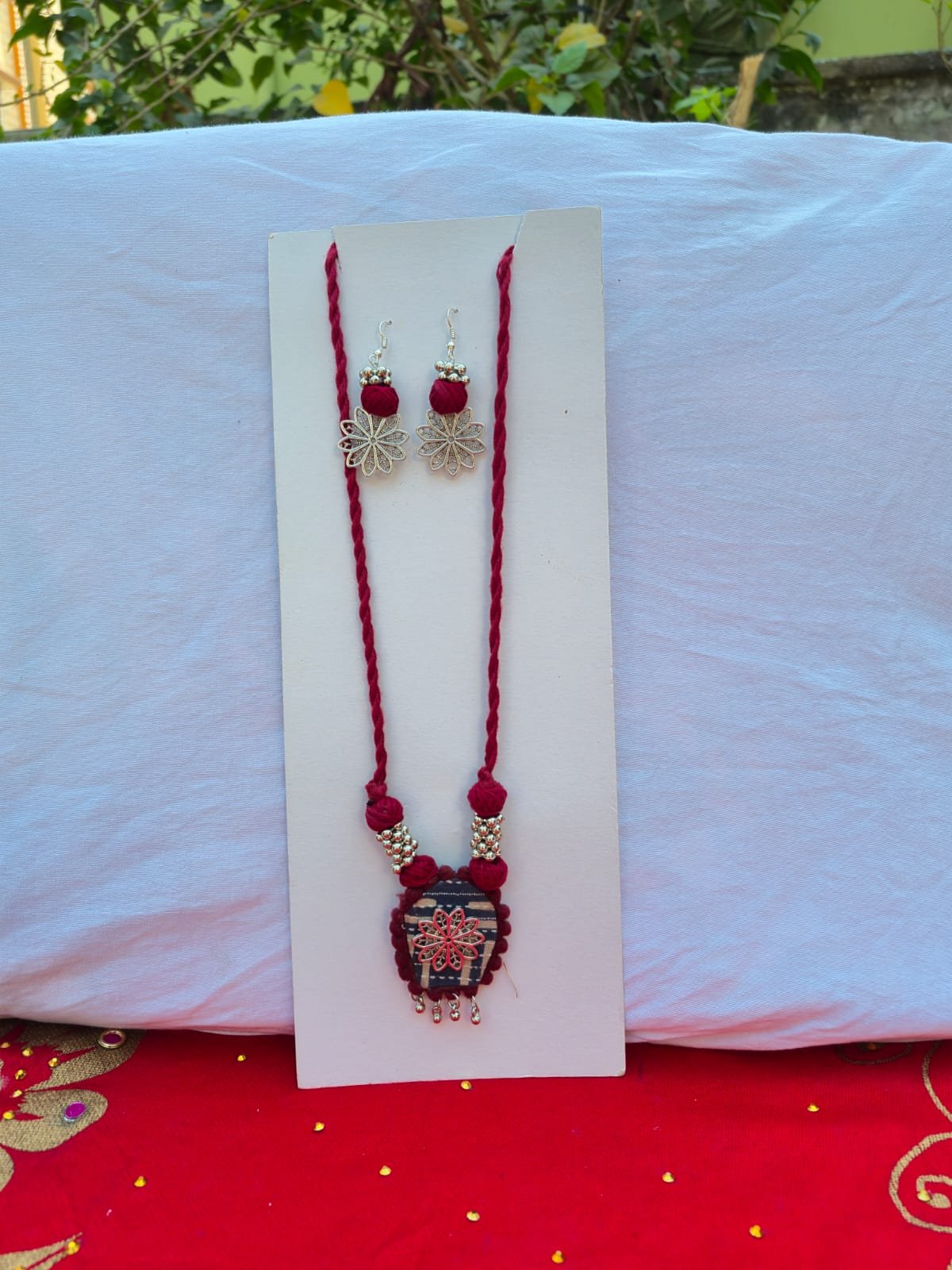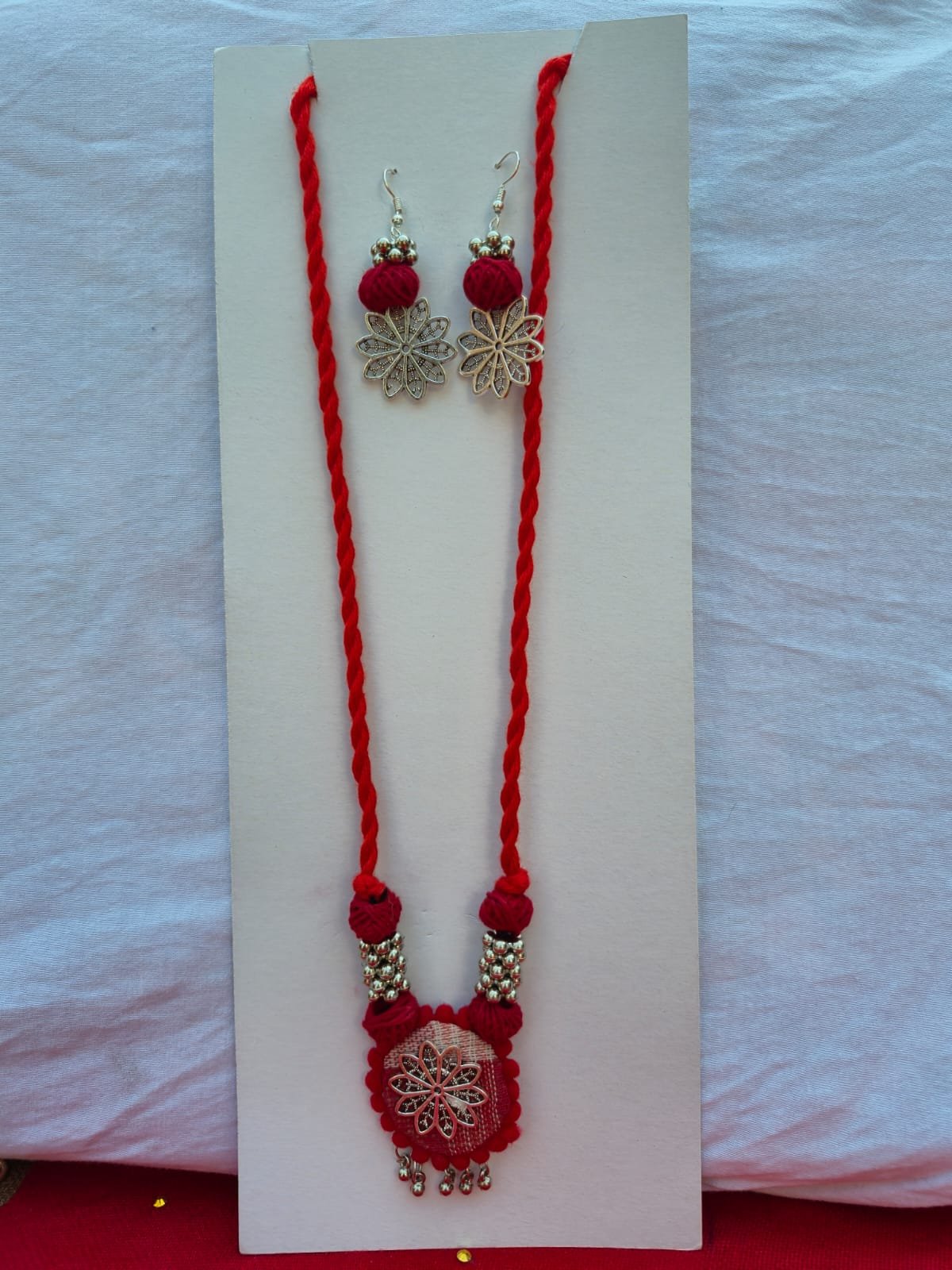 Unique Design: Features a handcrafted fabric-based pendant with a silver-tone floral filigree centerpiece and dangling beads.