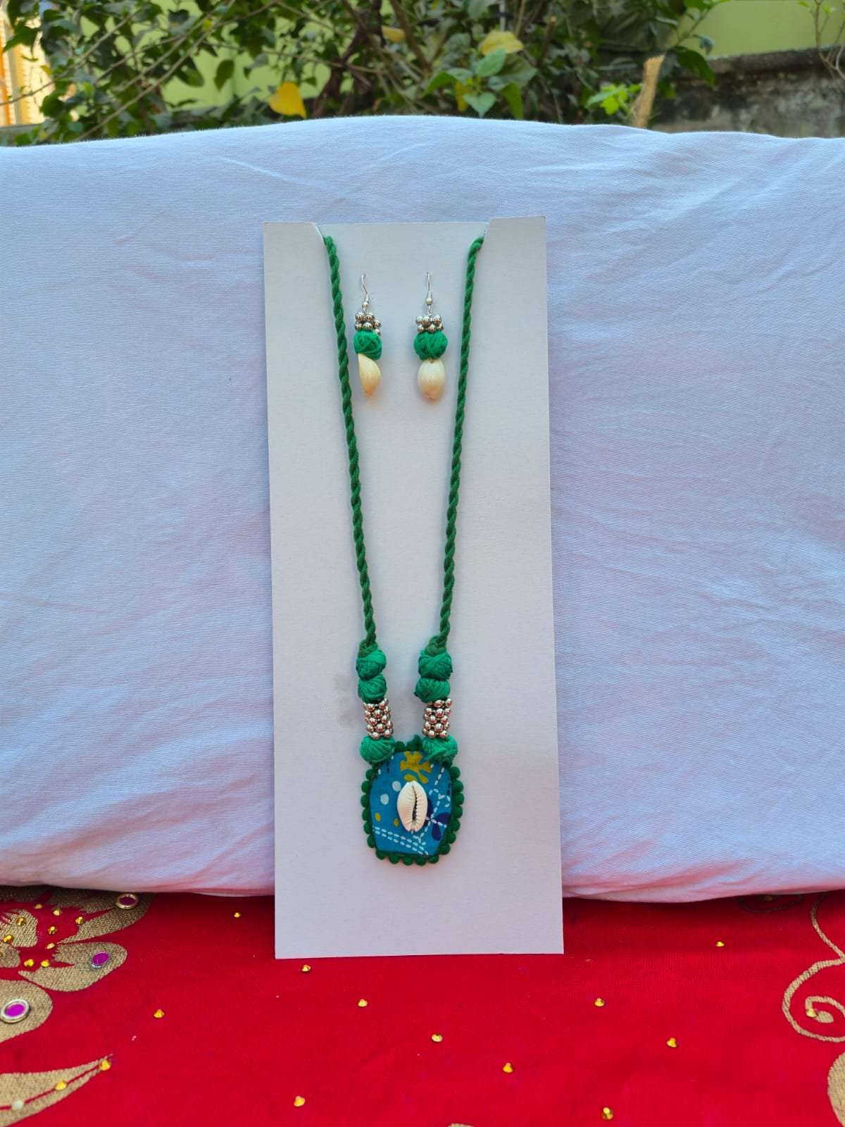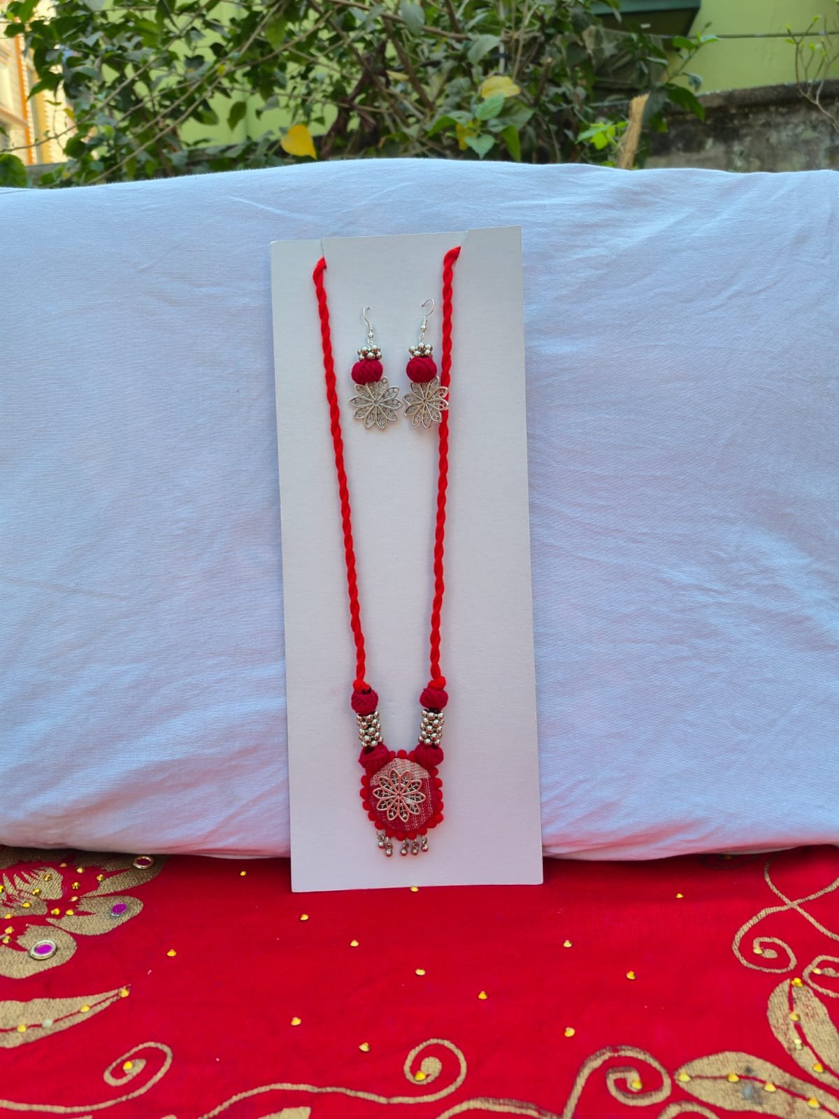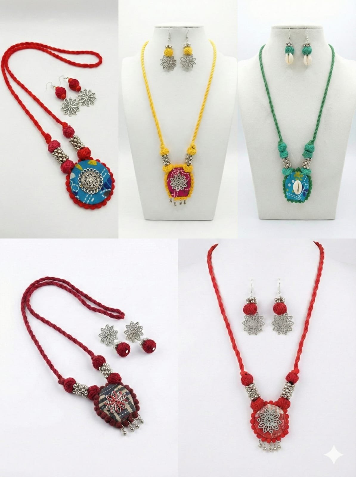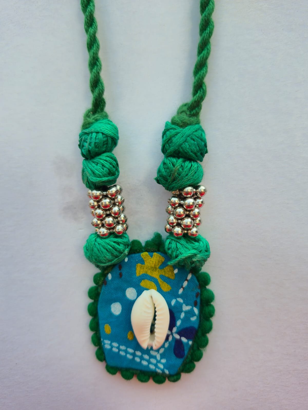 Unique Design: Features a handcrafted fabric-based pendant with a silver-tone floral filigree centerpiece and dangling beads.