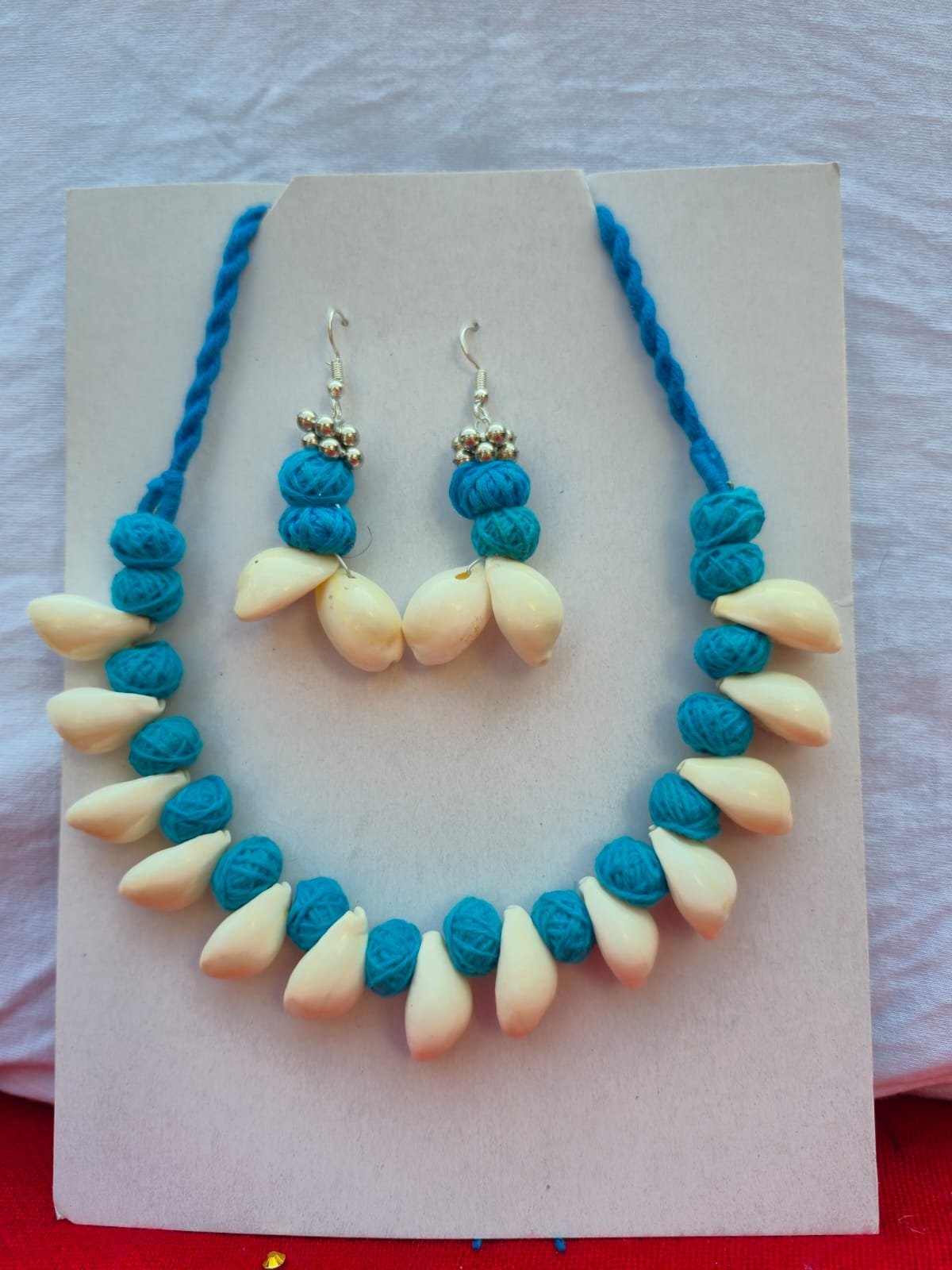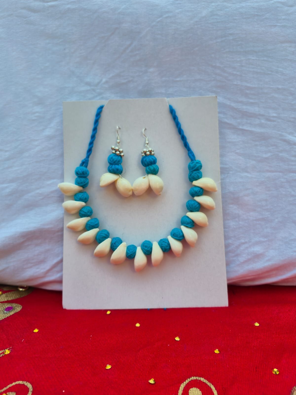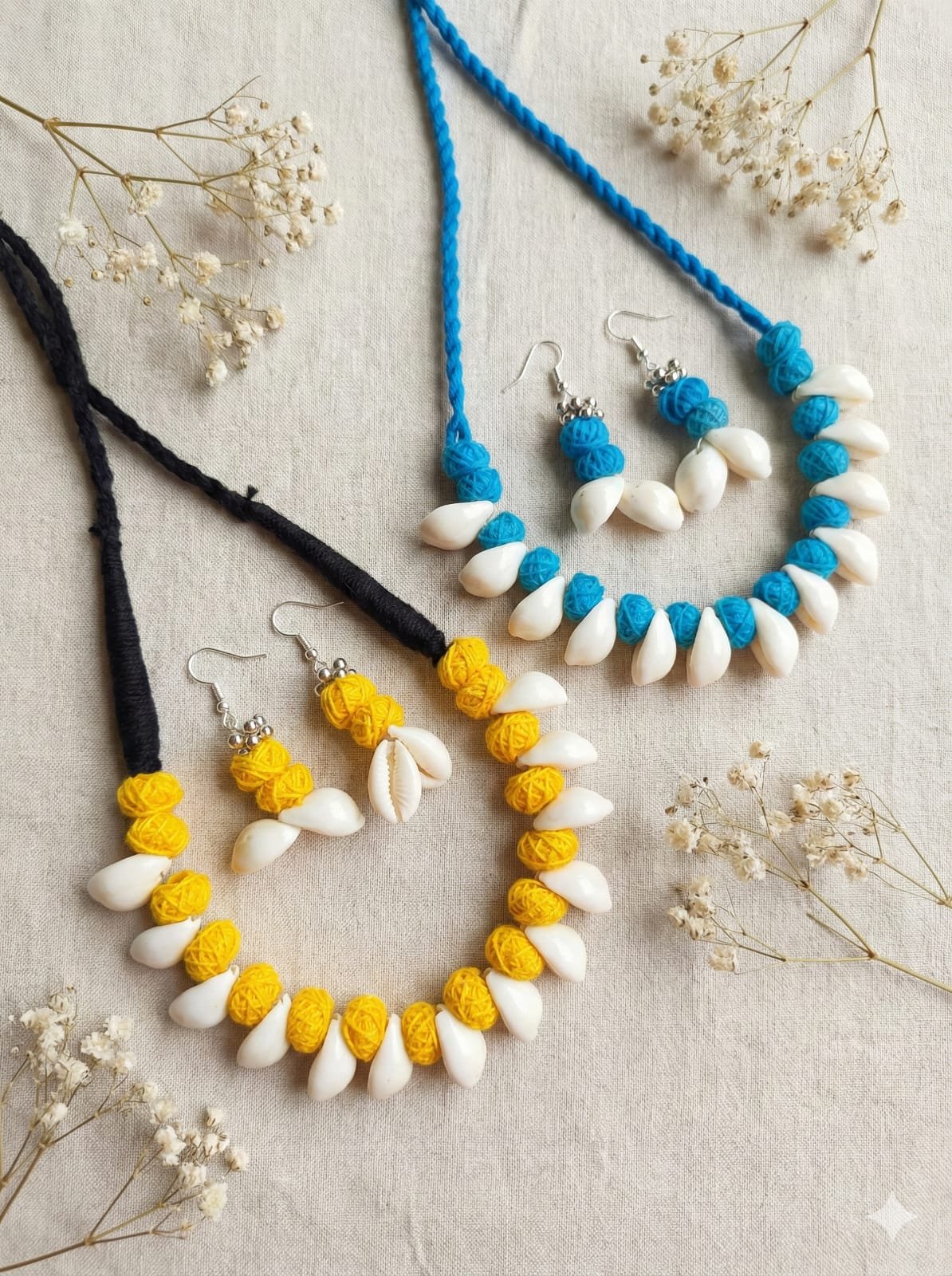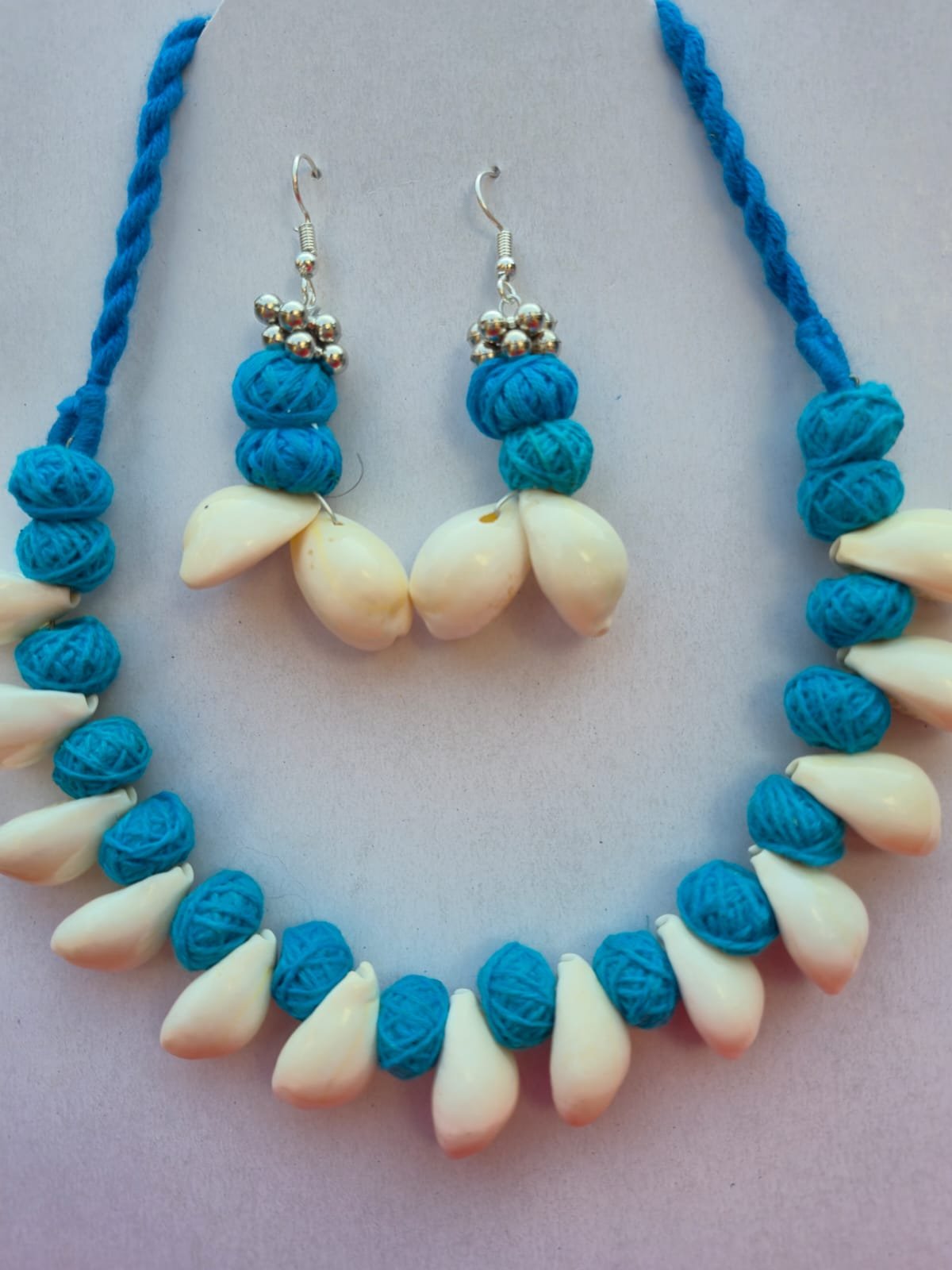 Elevate your jewelry collection with this exquisite artisanal necklace set. Masterfully crafted using the traditional thread-wrapping technique, this piece highlights the contrast between deep, electric blue fibers and the organic beauty of natural white cowrie (Kauri) shells.