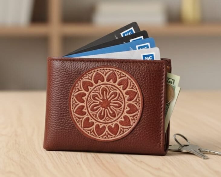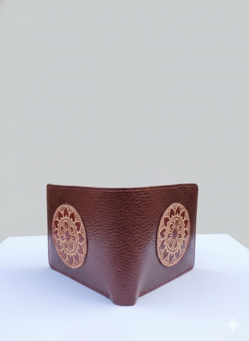 This handcrafted leather wallet combines functional design with traditional artistic elements.